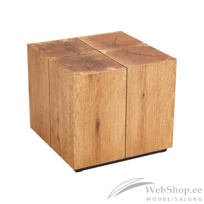 Abilaud BRONTE 50x50xH45cm, tamm. Massiivne, puidupakku meenutav abilaud on valmistatud MDF plaadist ning kaetud 6mm naturaalse tammespooniga. Laua pealmist pinda kaunistavad puidu südamiku ristlõiked, mille väikesed praod, aastaringid ja säsikaared annavad aimu puu elukaarest. Puidu pind on viimistletud õlivahaga. Laua must terasest alusraam on emailviimistlusega. Toote valmistamiseks on kasutatud FSC sertifikaadiga puitmaterjali.