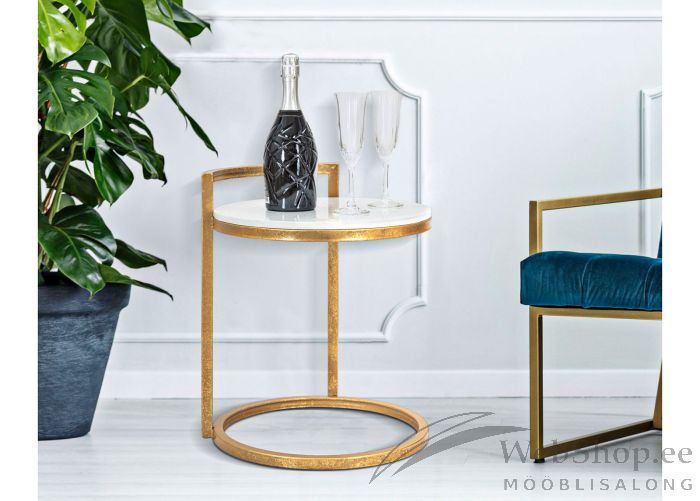 Kulla tooni metallist jalgadega abilaud. Lauaplaadiks on marmorplaat.