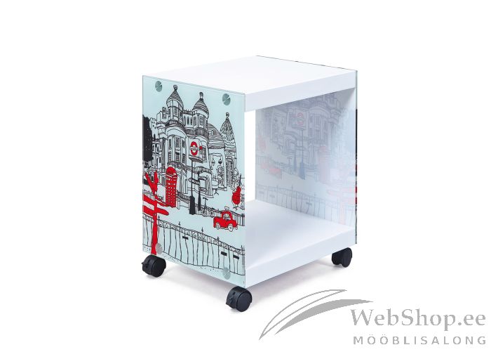 Praktiline ratastel abilaud. Laud on valmistatud MDF-mööbliplaadist. Viimistlus: valge/mitmevärviline. Pilt on kaetud turvaklaasiga.