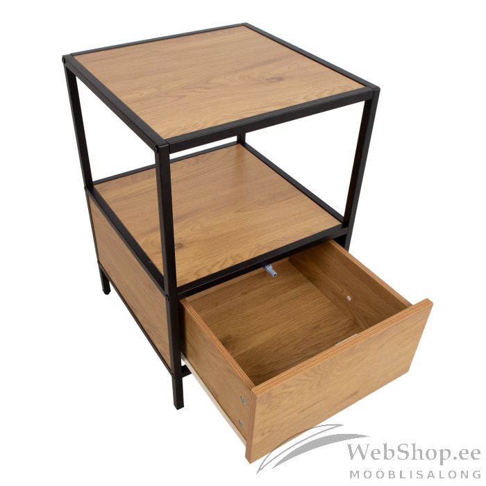 Abilaud/öökapp HEDVIG 40x40xH59cm, saar/must. Lauaplaat, riiul ja sahtel: saare dekooriga melamiinplaat. Raam on valmistatud metallist ja viimistletud musta pulbervärviga.