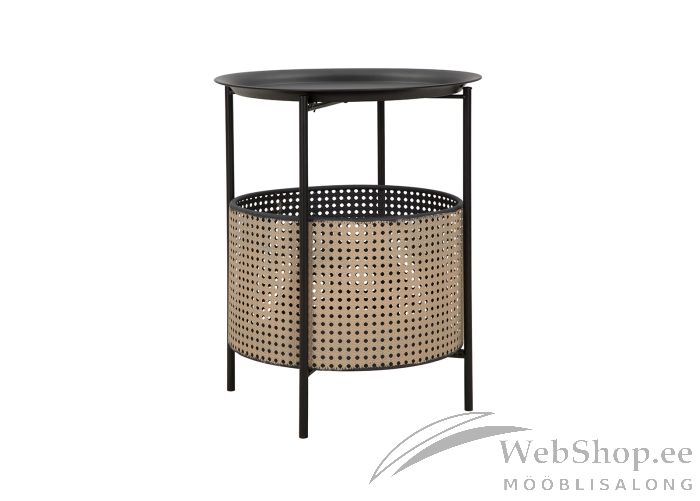 Stiilne ümar abilaud rotangist panipaigaga. Laua jalad ja tasapind on musta värvi metallist.