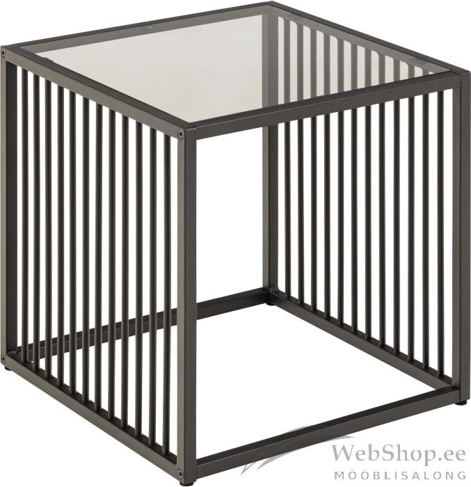 Abilaud, mis sobib ideaalselt kaasaegsesse koju. Karastatud suitsuklaasist lauaplaat. Ümmargused vertikaalsed metallist liistud musta pulbervärvitud metallaluse kahel küljel. Toote mõõdud on 40x40xH40cm.