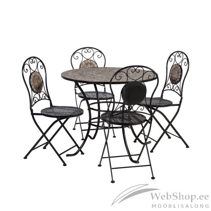 Aiamööbli komplekt MOSAIC laud, 4 tooli (38666). Laud D90xH70cm, mosaiikplaat: tumehall/pruun kivi, metallraam, värvus: must. Tool 36x36xH93cm, kokkupandav, metallraam.