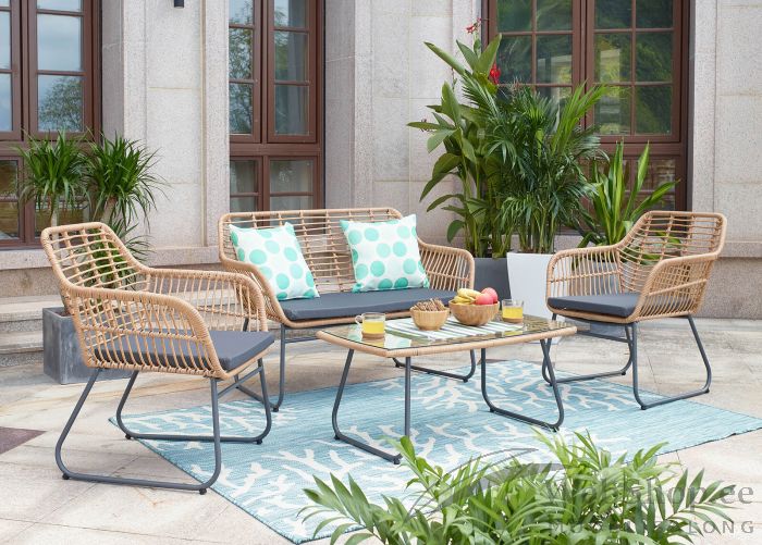 UV-kindlast polürattanist naturaalset tooni aiamööbli komplekt. Komplekti kuulub 2 tooli, 1 diivan ja 1 laud. Lauaplaat on turvaklaasist. Nii laua kui ka toolide raam on metallist. 3 tooli patja on plüester materjalist, halli värvi. Komplekt on ilmastikukindel ja sobib kasutamiseks nii välitingimustes kui ka näiteks talveaias. Tooted on kergesti puhastatavad leige vee ja lapiga.