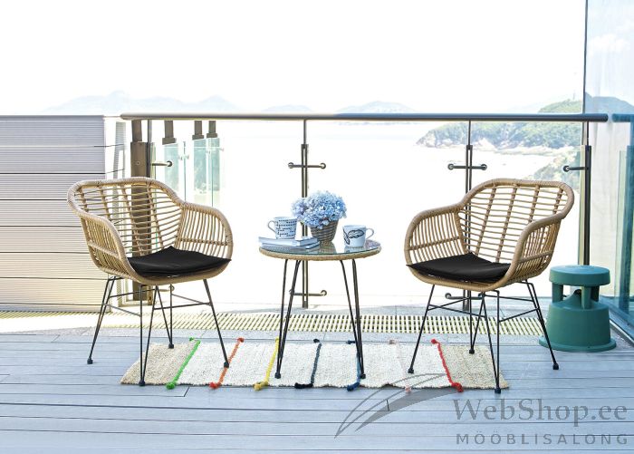 UV-kindlast polürattanist naturaalset tooni aiamööbli komplekt. Komplekti kuulub 2 tooli, 1 laud. Lauaplaat on turvaklaasist. Nii laua kui ka toolide raam on metallist. 2 tooli patja on plüester materjalist, musta värvi. Komplekt on ilmastikukindel ja sobib kasutamiseks nii välitingimustes kui ka näiteks talveaias. Tooted on kergesti puhastatavad leige vee ja lapiga.