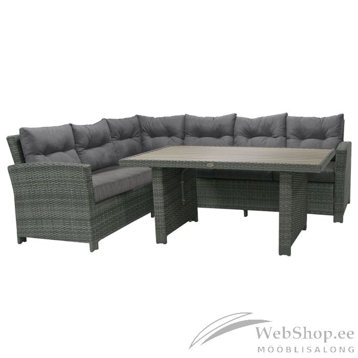 Aiamööblikomplekt PAVIA laud ja nurgadiivan, tumehall. Laua ja diivanite raamid on valmistatud alumiiniumist ja kaetud tumehalli plastikpunutisega. Laua mõõdud on 146x83xH67cm, lauaplaat: hallikaspruun harjatud kunstpuit. Diivan koosneb kahest osast: 3-kohaline diivan 191x77xH84cm, 2-kohaline diivan 166x77xH84cm. Istme kõrgus 47cm (koos padjaga), istme sügavus 48cm. Käetoe kõrgus maast 65cm. Komplekti kuulub 6 istmepatja ja 7 seljatoepatja. Patjade kattematerjal: hall polüesterkangas, täidis: plaatporoloon / kiudpolüester. Istmepatjade paksus 10cm, seljatoepatjade paksus 8cm. Toode on muutlikes ilmastikutingimustes hästi vastupidav ja lihtsalt hooldatav. Kaitset ilmastikuolude eest vajavad ainult padjad. Hea lahendus patjade igapäevaseks hoiustamiseks ja kuivana hoidmiseks on padjakast. Välitingimustes kasutatava mööbli eluea pikendamiseks soovitame kasutada välimööbli katteid. HOIUSTAMINE: suvehooaja lõppedes soovitame aiamööblit hoiustada siseruumides. Puhastage ja kuivatage mööbel enne hoiule panekut. Kasutage hoiustamiseks jahedat, kuiva ning hea ventilatsiooniga ruumi.