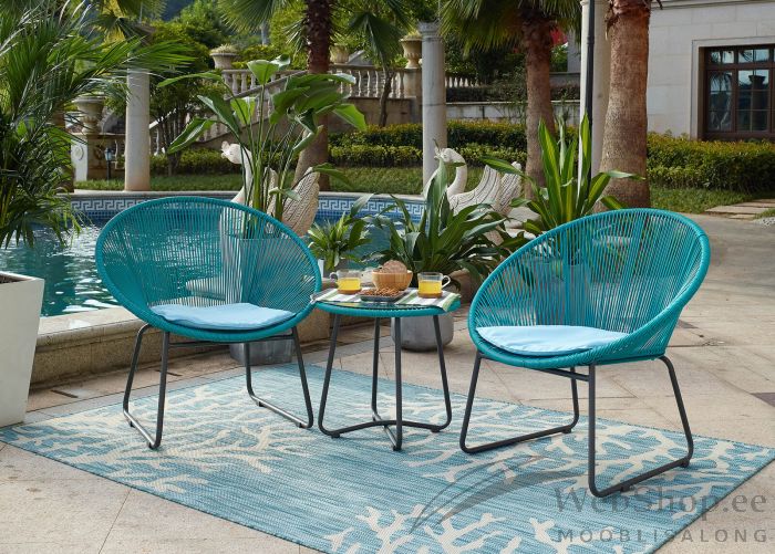 UV-kindlast polürattanist türkiisi tooni aiamööbli komplekt. Komplekti kuulub 2 tooli, 1 laud. Lauaplaat on turvaklaasist. Nii laua kui ka toolide raam on metallist. 2 tooli patja on plüester materjalist, sinist värvi. Komplekt on ilmastikukindel ja sobib kasutamiseks nii välitingimustes kui ka näiteks talveaias. Tooted on kergesti puhastatavad leige vee ja lapiga.