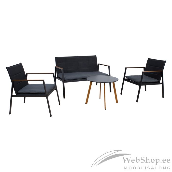 Aiamööblikomplekt ABER laud, 2-kohaline diivan ja 2 tugitooli. Lauaplaat ja komplekti kõigi osade raamid on valmistatud terasest ja viimistletud halli ja pulbervärviga. Lauajalad ja diivani ning toolide käetoed on värvitud pintsliga, et saavutada puitu meenutav välimus. Diivani ja toolide 2-kihilised textilene istmed on kergelt polsterdatud. Istmepatjade katted on valmistatud polüesterkangast. Laua mõõdud on D60xH50cm. Diivani mõõdud on 16x73xH79cm. Istmepadja paksus 5cm. Toode on muutlikes ilmastikutingimustes hästi vastupidav ja lihtsalt hooldatav. HOIUSTAMINE: suvehooaja lõppedes soovitame aiamööblit hoiustada siseruumides. Puhastage ja kuivatage mööbel enne hoiule panekut. Kasutage hoiustamiseks kuiva ning hea ventilatsiooniga ruumi.