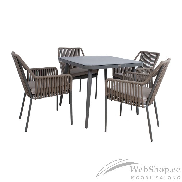 Aiamööblikomplekt ANDROS laud ja 4 tooli. Laua mõõdud on 90x90xH75cm. Lauaplaat: 5mm hall, kivi meenutav karastatud klaas. Laua ja toolide jalad ja raam on valmistatud alumiiniumist ja viimistletud halli pulbervärviga. Tooli selja- ja käetoed on kaetud textilene nöörist punutisega. Istmepadjad kuuluvad komplekti. Padjakatted on valmistatud polüesterkangast. Padja paksus 5cm. Istmepõhi on toestatud on alumiiniumliistudega. Tooli mõõdud on 56x57xH85cm, istmekõrgus 44cm. Kaalupiirang 100kg. Toolid on virnastatavad ning nende hoiustamine on lihtne ja ruumi säästev. Toode on muutlikes ilmastikutingimustes vastupidav ja lihtsalt hooldatav. Välitingimustes kasutatava mööbli eluea pikendamiseks soovitame kasutada välimööbli katteid. HOIUSTAMINE: suvehooaja lõppedes soovitame aiamööblit hoiustada siseruumides. Puhastage ja kuivatage mööbel enne hoiule panekut. Kasutage hoiustamiseks kuiva ning hea ventilatsiooniga ruumi.