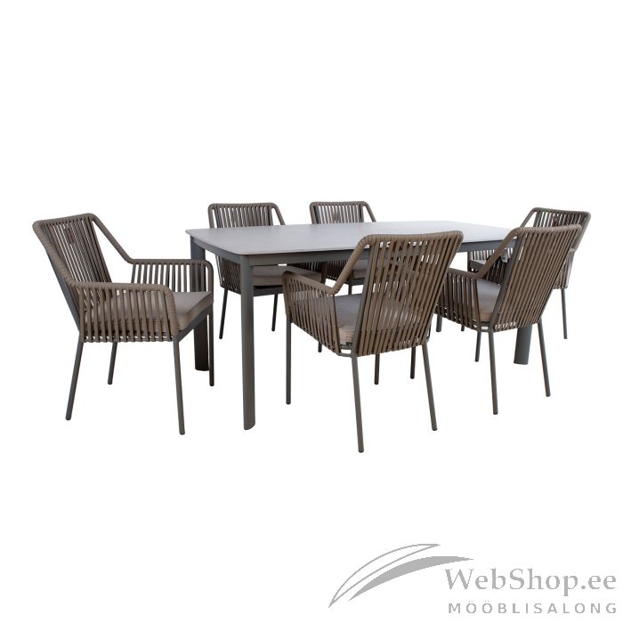 Aiamööblikomplekt ANDROS laud ja 6 tooli. Laua mõõdud on 180x90xH75cm. Lauaplaat: 11mm paagutatud kivi. Paagutatud kivist (sintered stone) lauaplaadi valmistamisel on kasutatud innovatiivset tehnoloogiat, mis jäljendab loodusliku kivi moodustumise protsessi sügaval maakoores. Kaoliini ehk portselansavi osakesed töödeldakse 1200 kraadises kuumuses, mille tulemusena moodustub materjal, mis oma omadustel ja välimuselt sarnaneb naturaalse kiviga. Lauaplaat on küll õhuke, kuid väga tugev (suhteline kõvadus Mohsi skaalal 7), kulumiskindel, talub hästi kõrget temperatuuri ja erinevaid ilmastikutingimusi, ei ima plekke ja seda on väga lihtne puhastada ja hooldada. Kuna keemilisi sideaineid ei ole kasutatud on materjal hügieeniline. TÄHELEPANU! Vältige lööke, põrutusi ja kukkumist. Laua ja toolide jalad ja raam on valmistatud alumiiniumist ja viimistletud halli pulbervärviga. Tooli selja- ja käetoed on kaetud textilene nöörist punutisega. Istmepadjad kuuluvad komplekti. Padjakatted on valmistatud polüesterkangast. Padja paksus 5cm. Istmepõhi on toestatud on alumiiniumliistudega. Tooli mõõdud on 56x57xH85cm, istmekõrgus 44cm. Kaalupiirang 100kg. Toolid on virnastatavad ning nende hoiustamine on lihtne ja ruumi säästev. Toode on muutlikes ilmastikutingimustes vastupidav ja lihtsalt hooldatav. Välitingimustes kasutatava mööbli eluea pikendamiseks soovitame kasutada välimööbli katteid. HOIUSTAMINE: suvehooaja lõppedes soovitame aiamööblit hoiustada siseruumides. Puhastage ja kuivatage mööbel enne hoiule panekut. Kasutage hoiustamiseks kuiva ning hea ventilatsiooniga ruumi.