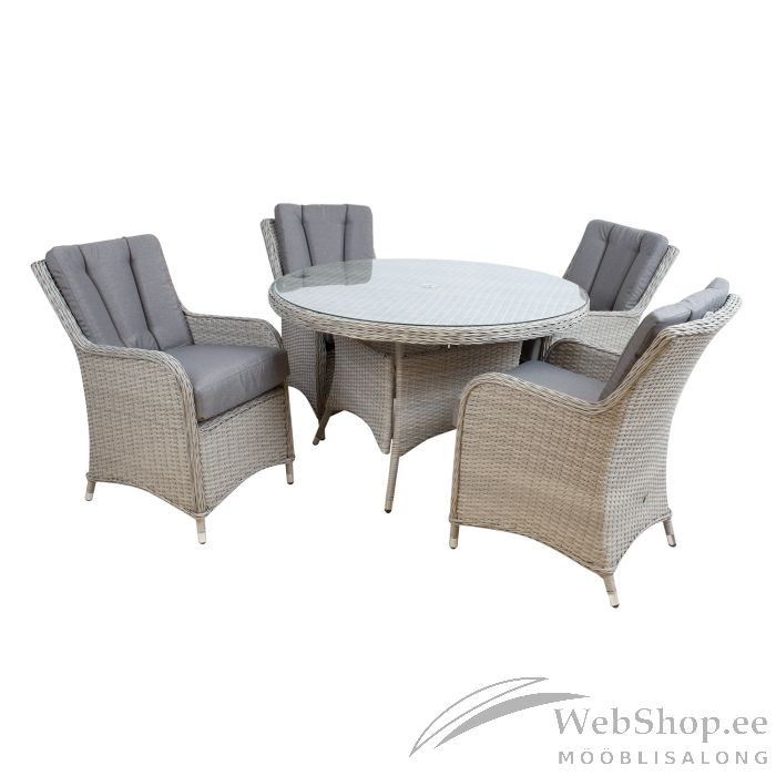 Aiamööblikomplekt ASCOT laud ja 4 tooli. Laua mõõdud on D121xH75cm. Laua ja toolide raamid on valmistatud alumiiniumist ja kaetud halli plastikpunutisega. Lauaplaat: 8mm karastatud läbipaistev klaas. Laua keskel on auk (D4cm) päikesevarju jaoks. Tugitooli mõõdud on 58x70xH90cm. Istme laius 48cm, istme sügavus 49cm, istmekõrgus koos padjaga 54cm. Käetoe kõrgus maast 66cm. Padjad kuuluvad komplekti. Padjakatted on valmistatud hallist polüesterkangast. Istmepadja mõõdud on 48x49xH13cm, seljatoepadja mõõdud 50x45x5cm. Toode on muutlikes ilmastikutingimustes vastupidav ja väga lihtsalt hooldatav, kaitset ilmastikutingimuste eest vajavad ainult padjad. Välitingimustes kasutatava mööbli eluea pikendamiseks soovitame kasutada välimööbli katteid. HOIUSTAMINE: suvehooaja lõppedes soovitame aiamööblit hoiustada siseruumides. Puhastage ja kuivatage mööbel enne hoiule panekut. Kasutage hoiustamiseks kuiva ning hea ventilatsiooniga ruumi.