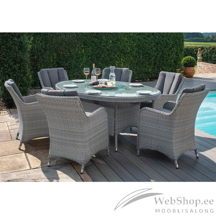 Aiamööblikomplekt ASCOT laud ja 6 tooli. Laua mõõdud on 180x120xH75cm. Laua ja toolide raamid on valmistatud alumiiniumist ja kaetud halli plastikpunutisega. Lauaplaat: 8mm karastatud läbipaistev klaas. Lauaga komplekti kuulub pöörlev klaasist serveerimisalus D60cm. Laua ja serveerimisaluse keskel on auk (D4cm) päikesevarju jaoks. Tugitooli mõõdud on 58x70xH90cm. Istme laius 48cm, istme sügavus 49cm, istmekõrgus koos padjaga 54cm. Käetoe kõrgus maast 66cm. Padjad kuuluvad komplekti. Padjakatted on valmistatud hallist polüesterkangast. Istmepadja mõõdud on 48x49xH13cm, seljatoepadja mõõdud 50x45x5cm. Toode on muutlikes ilmastikutingimustes vastupidav ja väga lihtsalt hooldatav, kaitset ilmastikutingimuste eest vajavad ainult padjad. Välitingimustes kasutatava mööbli eluea pikendamiseks soovitame kasutada välimööbli katteid. HOIUSTAMINE: suvehooaja lõppedes soovitame aiamööblit hoiustada siseruumides. Puhastage ja kuivatage mööbel enne hoiule panekut. Kasutage hoiustamiseks kuiva ning hea ventilatsiooniga ruumi.