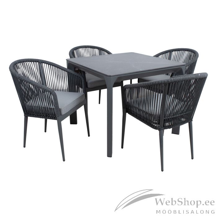Aiamööblikomplekt CARVES laud ja 4 tooli. Laud CARVES ühendab endas minimalistliku disaini ja uudse tehnoloogia. Paagutatud kivist (sintered stone) lauaplaadi valmistamisel on kasutatud innovatiivset tehnoloogiat, mis jäljendab loodusliku kivi moodustumise protsessi sügaval maakoores. Kaoliini ehk portselansavi osakesed töödeldakse 1200 kraadises kuumuses, mille tulemusena moodustub materjal, mis oma omadustel ja välimuselt sarnaneb naturaalse kiviga. Lauaplaat on küll õhuke, kuid väga tugev (suhteline kõvadus Mohsi skaalal 7), kulumiskindel, talub hästi kõrget temperatuuri ja erinevaid ilmastikutingimusi, ei ima plekke ja seda on väga lihtne puhastada ja hooldada. Kuna keemilisi sideaineid ei ole kasutatud on materjal hügieeniline. TÄHELEPANU! Vältige lööke, põrutusi ja kukkumist. Laua mõõdud on 90x90xH75cm, lauaplaadi paksus 11mm. Laua ja toolide jalad ja raam on valmistatud alumiiniumist ja viimistletud halli pulbervärviga. Tooli selja- ja käetoed on kaetud nöörpunutisega. Istmepadi kuulub komplekti. Padjakate on valmistatud polüesterkangast. Padja mõõdud 45x42x5cm. Istmepõhi on toestatud alumiiniumliistudega. Tooli mõõdud on 57x65xH81cm, istmekõrgus 44cm. Kaalupiirang 100kg. Toolid on virnastatavad ning nende hoiustamine on lihtne ja ruumi säästev. Toode on muutlikes ilmastikutingimustes vastupidav ja lihtsalt hooldatav. Välitingimustes kasutatava mööbli eluea pikendamiseks soovitame kasutada välimööbli katteid. HOIUSTAMINE: suvehooaja lõppedes soovitame aiamööblit hoiustada siseruumides. Puhastage ja kuivatage mööbel enne hoiule panekut. Kasutage hoiustamiseks kuiva ning hea ventilatsiooniga ruumi.