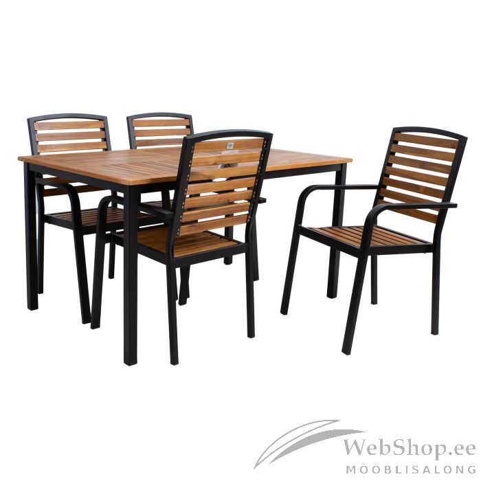 Aiamööblikomplekt DALYA laud ja 4 tooli. Laua ja tooli jalad ja raamid on valmistatud terasest ja viimistletud pruuni pulbervärviga. Lauaplaat ja toolide istmed ja seljatoed on valmistatud akaatsiapuidust ja viimistletud puidukitseõliga. Toolid on virnastatavad. Laua mõõdud on 140x90xH75cm. Tooli mõõdud on 56x60,5xH93,5cm. Kaalupiirang 100kg. HOOLDUS: puit on elav looduslik materjal, mille välisilme ilmastikutingimuste tõttu muutub. Puhastage mööblit regulaarselt, kaitske liigniiskuse ja UV kiirguse eest. Kerge lihvimine ja uus õlikiht vähemalt korra aastas on piisav värskenduskuur mööblile uue näo andmiseks. HOIUSTAMINE: suvehooaja lõppedes soovitame aiamööblit hoiustada siseruumides. Puhastage ja kuivatage mööbel enne hoiule panekut. Kasutage hoiustamiseks kuiva ning hea ventilatsiooniga ruumi. Kaitske mööblit hoiustamise ajal otsese päikesevalguse eest.