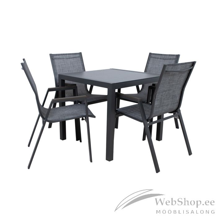 Aiamööblikomplekt DELGADO laud ja 4 tooli. Laua mõõdud on 80x80xH72cm. Lauaplaat: 5mm hall karastatud klaas. Laua ja toolide jalad ja raam on valmistatud terasest ja viimistletud halli pulbervärviga. Tooli textilene iste laseb hästi õhku läbi, kuivab kiiresti ja seda on lihtne puhastada. Tooli käetugedel on hallid kunstpuidust liistud. Toolid on virnastatavad ning nende hoiustamine on lihtne ja ruumi säästev. Tooli üldmõõdud on 56x61xH90cm. Kaalupiirang 100kg.