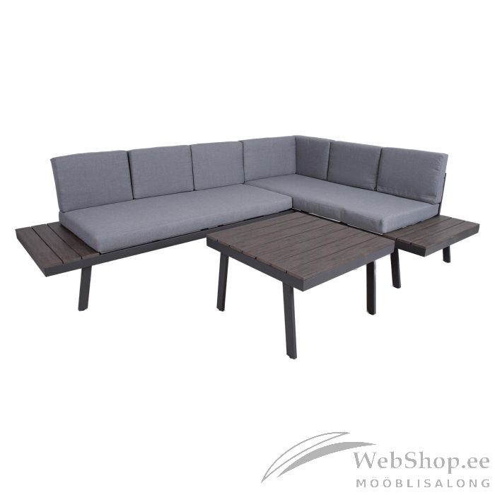 Aiamööblikomplekt DELGADO nurgadiivan ja laud. Nurgadiivani ja laua põhikonstruktsioon on valmistatud terasest ja viimistletud halli pulbervärviga. Lauaplaat ja abilauad diivani külgedel on kaetud kunstpuidust liistudega. Komplekti kuulub 2 istmepatja 148x73xH10cm, 6 seljatoepatja 50x35x10cm, 1 seljatoepadi 61x35x10cm. Padjakatted on valmistatud hallist polüesterkangast. Padjakatted on eemaldatavad ja pestavad. Diivanilaua mõõdud on 70x70xH44,5cm. Nurgadiivan koosneb kahest osast mõõtudega 180x75xH65cm ja 182x75xH65cm. Diivani üldmõõdud on 255x75/182xH65cm. Istme kõrgus raami ääreni on 32cm. Abilaua mõõdud on 75x29,5cm. Toode on muutlikes ilmastikutingimustes hästi vastupidav ja lihtsalt hooldatav. Kaitset ilmastikuolude eest vajavad ainult padjad. Hea lahendus patjade igapäevaseks hoiustamiseks ja kuivana hoidmiseks on padjakast. Välitingimustes kasutatava mööbli eluea pikendamiseks soovitame kasutada välimööbli katteid. HOIUSTAMINE: suvehooaja lõppedes soovitame aiamööblit hoiustada siseruumides. Puhastage ja kuivatage mööbel enne hoiule panekut. Kasutage hoiustamiseks kuiva ning hea ventilatsiooniga ruumi.