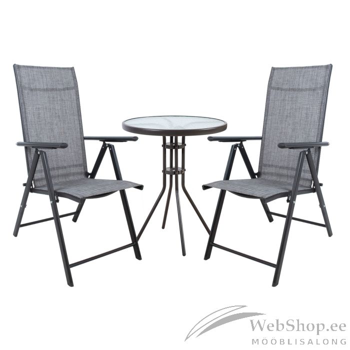 Aiamööblikomplekt DUBLIN laud ja 2 kokkupandavat tooli, hall. Laua mõõdud on D60xH70cm. Lauaplaat: 5mm läbipaistev laineline klaas. Laua raam ja jalad on valmistatud terasest ja viimistletud tumepruuni pulbervärviga. Tooli üldmõõdud on 54x69xH102cm. Tooli textilene iste laseb hästi õhku läbi, kuivab kiiresti ja seda on lihtne puhastada. Tooli raam on valmistatud terasest ja viimistletud tumehalli pulbervärviga. Seljatoe reguleerimiseks tõstke käetoed üles, valige sobiv seljatoe asend ja fikseerige käetoed. Võimalik on valida viie erineva positsiooni vahel. Kokkupanduna on tooli lihtne kaas võtta või hoiustada. Tooli mõõdud kokkupanduna 54x81x17cm. Istme laius 45cm, istme sügavus 45cm, istme kõrgus 44cm. Seljatoe kõrgus 69cm, käetoe kõrgus maast 63cm. Kaalupiirang 100kg.