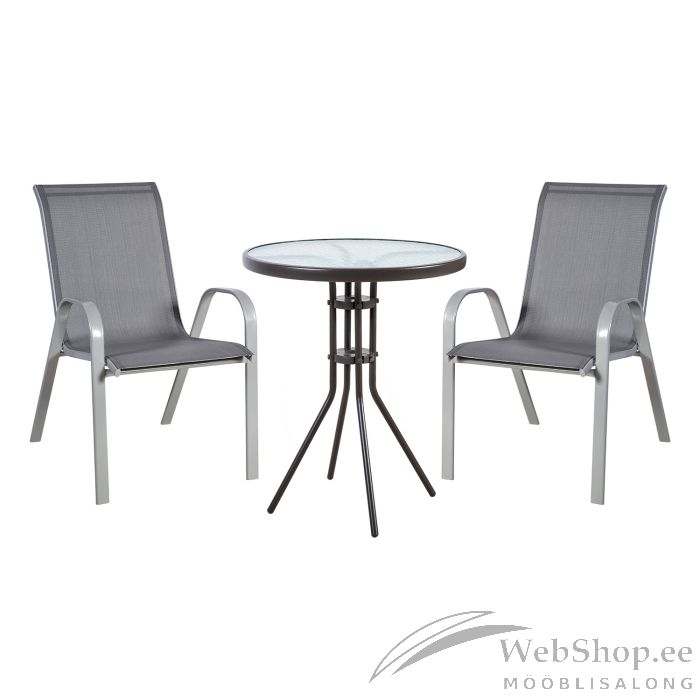 Aiamööblikomplekt DUBLIN laud ja 2 tooli, hall. Laua mõõdud on D60xH70cm. Lauaplaat: 5mm läbipaistev laineline klaas. Laua raam ja jalad on valmistatud terasest ja viimistletud tumepruuni pulbervärviga. Tooli textilene iste laseb hästi õhku läbi, kuivab kiiresti ja seda on lihtne puhastada. Tooli raam ja jalad on valmistatud terasest ja viimistletud halli pulbervärviga. Toolid on virnastatavad ning nende hoiustamine on lihtne ja ruumi säästev. Tooli üldmõõdud on 55,5x73xH90cm. Istme laius 45cm, istme sügavus 41cm, istme kõrgus 44cm. Seljatoe kõrgus 57cm. Käetoe kõrgus maast 61cm. Kaalupiirang 100kg.