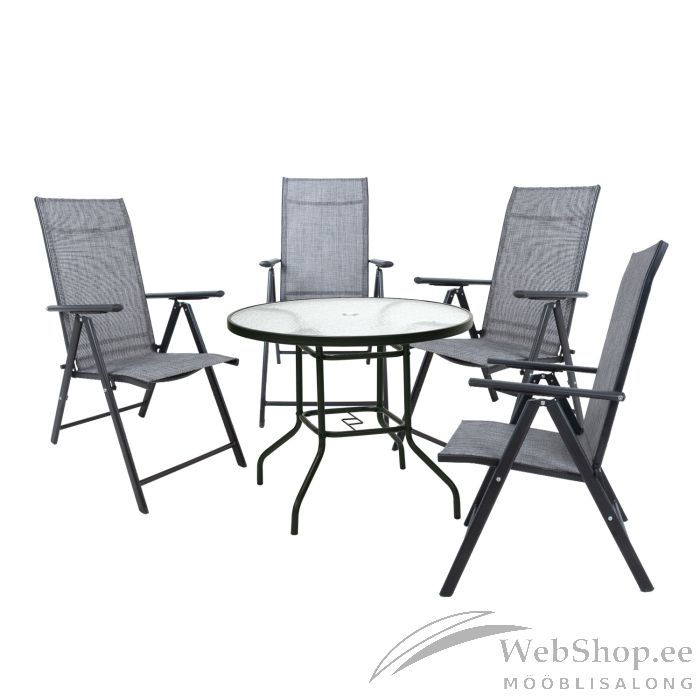Aiamööblikomplekt DUBLIN laud ja 4 kokkupandavat tooli, hall. Laua mõõdud on D90xH71cm. Lauaplaat: 5mm läbipaistev laineline klaas. Laua keskel on päikesevarjuauk D4cm. Laua raam ja jalad on valmistatud terasest ja viimistletud tumepruuni pulbervärviga. Tooli üldmõõdud on 54x69xH102cm. Tooli textilene iste laseb hästi õhku läbi, kuivab kiiresti ja seda on lihtne puhastada. Tooli raam on valmistatud terasest ja viimistletud tumehalli pulbervärviga. Seljatoe reguleerimiseks tõstke käetoed üles, valige sobiv seljatoe asend ja fikseerige käetoed. Võimalik on valida viie erineva positsiooni vahel. Kokkupanduna on tooli lihtne kaas võtta või hoiustada. Tooli mõõdud kokkupanduna 54x81x17cm. Istme laius 45cm, istme sügavus 45cm, istme kõrgus 44cm. Seljatoe kõrgus 69cm, käetoe kõrgus maast 63cm. Kaalupiirang 100kg.