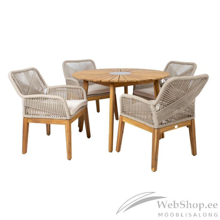 Aiamööblikomplekt FLORIDA laud ja 4 tooli. Laud ja toolide jalad ning alusraam on valmistatud akaatsia puidust ja viimistletud tiikpuu toonis puidukaitseõliga. Tooli istme raam on valmistatud galvaniseeritud terastorust ja kaetud elegantse nöörpunutisega. Istmepadi on kaetud polüesterkangaga. Padja paksus 5cm. Laua mõõdud on D110xH75cm. Tooli mõõdud on 66,5x57,5xH83cm. Tootel on FSC sertifikaat. HOOLDUS: puit on elav looduslik materjal, mille välisilme ilmastikutingimuste tõttu muutub. Puhastage mööblit regulaarselt, kaitske liigniiskuse ja UV kiirguse eest. Kerge lihvimine ja uus õlikiht vähemalt korra aastas on piisav värskenduskuur mööbli puidust osadele uue näo andmiseks. HOIUSTAMINE: suvehooaja lõppedes soovitame aiamööblit hoiustada siseruumides. Puhastage ja kuivatage mööbel enne hoiule panekut. Kasutage hoiustamiseks kuiva ning hea ventilatsiooniga ruumi.