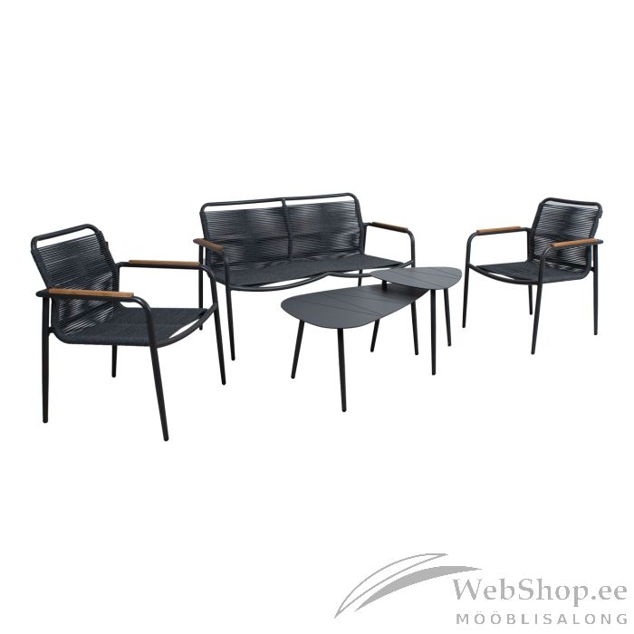 Aiamööblikomplekt NEBO 2 lauda, pink ja 2 tooli. Pingi ja toolide raamid ning laudade jalad ja plaadid on valmistatud alumiiniumist ja viimistletud halli pulbervärviga. Pingi ja toolide istmed on kaetud halli nöörpunutisega. Käetugesid kaunistavad tiikpuust liistud. Laudade mõõdud on 98x60xH42cm ja 54x52xH48cm. Tooli mõõdud on 64x68xH85cm. Pingi mõõdud on 134x68xH85cm. Toode on muutlikes ilmastikutingimustes vastupidav ja lihtsalt hooldatav. HOIUSTAMINE: suvehooaja lõppedes soovitame aiamööblit hoiustada siseruumides. Puhastage ja kuivatage mööbel enne hoiule panekut. Kasutage hoiustamiseks kuiva ning hea ventilatsiooniga ruumi.