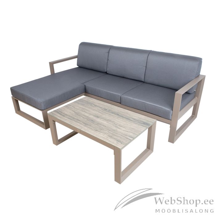 Aiamööblikomplekt POSTA nurgadiivan ja laud, beeþ. Diivani ja laua tugev põhikonstruktsioon on valmistatud alumiiniumist ja viimistletud beeþi pulbervärviga. Paksud padjad tagavad suurepärase istumismugavuse. Diivanilaual on pilkupüüdev, puitu imiteeriv karastatud klaasist plaat (paksus 5mm). Padjakatted on valmistatud väga hea ilmastikukindlusega hallist olefin kangast. Komplekti kuulub 2 istmepatja 70x74x12cm, 1 istmepadi 77/70x 150x12cm ja 3 seljatoepatja 70x42x12cm. Lukuga suletavad padjakatted on eemaldatavad ja pestavad. Nurgadiivan koosneb kahest osast - 3 kohaline diivan 224x78,5xH63,5cm ja tumba 77x75xH30cm, mille võib paigutada omal soovil, moodustades nurga paremale või vasakule. Istme kõrgus raami ääreni on 30cm, koos padjaga 42cm. Laua mõõdud on 100x60xH42cm. Diivani ja laua alumiiniumprofiilide mõõdud on 70x35x1,2mm/55x8x1,2mm. Toode on muutlikes ilmastikutingimustes väga hästi vastupidav ja lihtsalt hooldatav. Kaitset ilmastikuolude eest vajavad ainult padjad. Välitingimustes kasutatava mööbli eluea pikendamiseks soovitame kasutada välimööbli katteid. HOIUSTAMINE: suvehooaja lõppedes soovitame aiamööblit hoiustada siseruumides. Puhastage ja kuivatage mööbel enne hoiule panekut. Kasutage hoiustamiseks kuiva ning hea ventilatsiooniga ruumi.