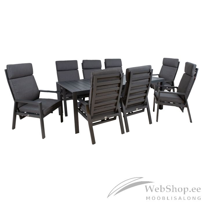Aiamööblikomplekt TOMSON laud ja 8 tooli. Laua mõõdud on 216x100xH73cm. Lauaplaat ja jalad ning toolide jalad ja raam on valmistatud alumiiniumist ja viimistletud tumehalli pulbervärviga. Tooli seljatugi on reguleeritav gaasamordi abil. Reguleerimisnupp asub tooli istme paremal küljel. Istmepadi kuulub komplekti. Istmepadja mõõdud on 122x51xH6cm. Padjakate on valmistatud hallist olefin kangast. Padjakate on eemaldav ja pestav. Tooli istme laius on 50cm, istme sügavus 48cm, istme kõrgus 40,5/46,5cm. Käetoe kõrgus maast 61cm. Kaalupiirang 120kg. Toode on muutlikes ilmastikutingimustes väga hästi vastupidav ja lihtsalt hooldatav. Kaitset ilmastikuolude eest vajavad ainult padjad. HOIUSTAMINE: suvehooaja lõppedes soovitame aiamööblit hoiustada siseruumides. Puhastage ja kuivatage mööbel enne hoiule panekut. Kasutage hoiustamiseks kuiva ning hea ventilatsiooniga ruumi.