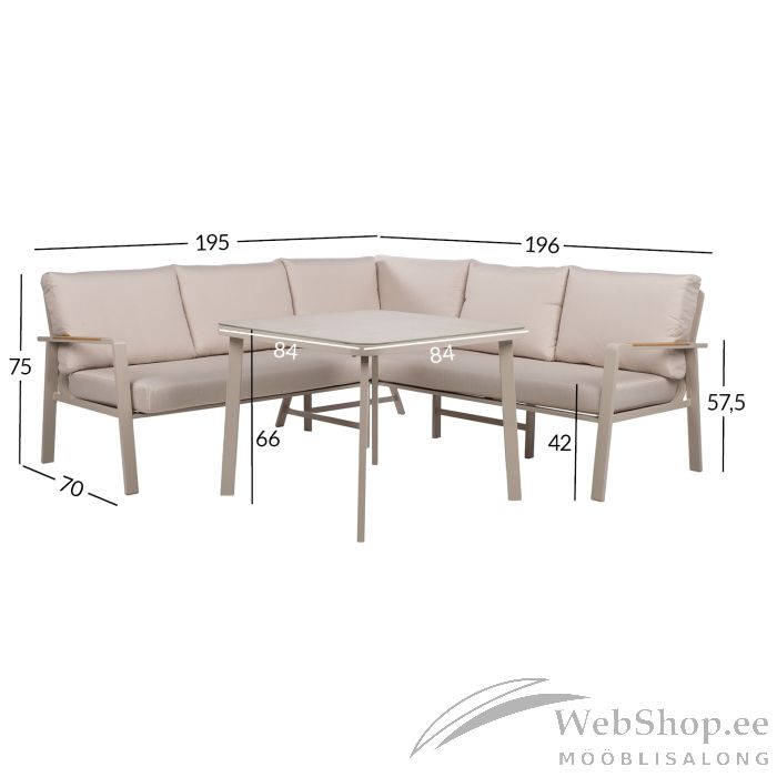 Diivani üldmõõdud: 195 x 196 x H75 cm. Istme kõrgus 31/42 cm. Käetoe kõrgus maast 57,5 cm.