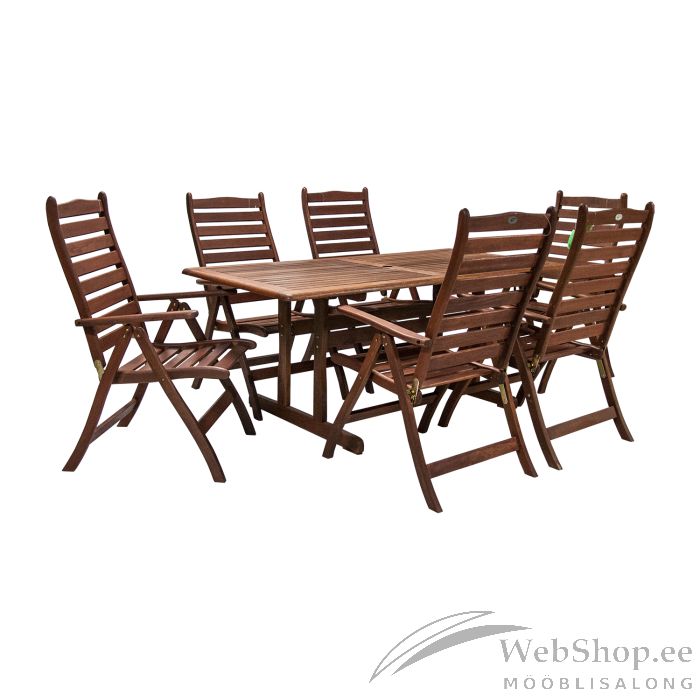 Aiamööblikomplekt VENICE laud ja 6 tooli (07090). Laud 180x90xH74cm, puit: meranti, viimistlus: õlitatud. Tool BORDEAUX, 60x68xH110cm, kokkupandav, reguleeritav seljatugi, puit: meranti, viimistlus: õlitatud. Toode on ilmastikukindel. Lisainfo: kaalupiirang 100kg. HOOLDUS: puit on elav looduslik materjal, mille välisilme ilmastikutingimuste mõjul muutub. Puhastage mööblit regulaarselt, kaitske liigniiskuse ja UV kiirguse eest. Kerge lihvimine ja uus õlikiht vähemalt korra aastas on piisav värskenduskuur mööblile jälle uue näo andmiseks.