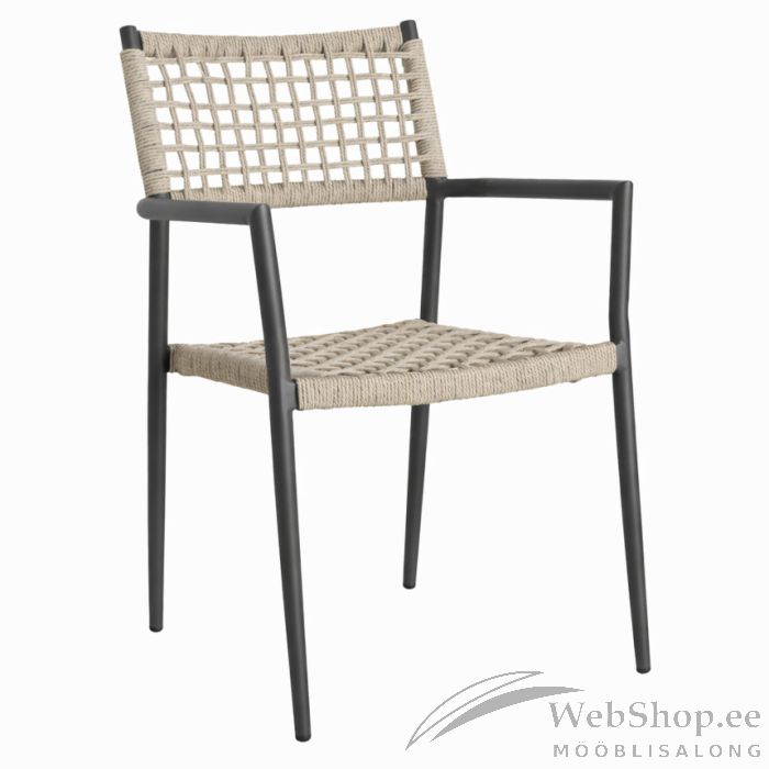 Kaasaegne aiatool ühendab endas kerguse, vastupidavuse ja ajatu disaini. Tooli tumehall alumiiniumraam on tugev ja sobib suurepäraselt välistingimustesse, olles samal ajal kerge ning lihtsasti liigutatav. Iste ja seljatugi on kaetud punutud materjaliga, mis lisab toolile naturaalset ilmet ja tagab mugava istumiskogemuse.