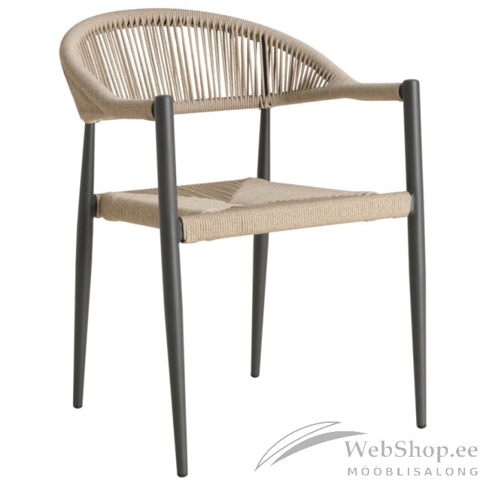 Kaasaegne aiatool ühendab endas kerguse, vastupidavuse ja ajatu disaini. Tooli tumehall alumiiniumraam on tugev ja sobib suurepäraselt välistingimustesse, olles samal ajal kerge ning lihtsasti liigutatav. Iste ja seljatugi on kaetud punutud PE materjaliga, mis lisab toolile naturaalset ilmet ja tagab mugava istumiskogemuse. Istme kõrgus 45 cm, istme sügavus 45 cm. Maksimaalne kandevõime kuni 110 kg. Pehmelt kaarduv seljatugi toetab hästi selga ning muudab tooli sobivaks nii söögilaua äärde kui ka lõõgastumiseks terrassil või aias.