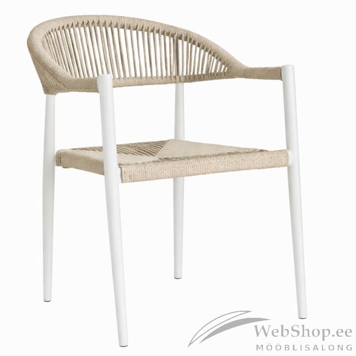 Kaasaegne aiatool ühendab endas kerguse, vastupidavuse ja ajatu disaini. Tooli valge alumiiniumraam on tugev ja sobib suurepäraselt välistingimustesse, olles samal ajal kerge ning lihtsasti liigutatav. Iste ja seljatugi on kaetud punutud PE materjaliga, mis lisab toolile naturaalset ilmet ja tagab mugava istumiskogemuse. Istme kõrgus 45 cm, istme sügavus 45 cm. Maksimaalne kandevõime kuni 110 kg. Pehmelt kaarduv seljatugi toetab hästi selga ning muudab tooli sobivaks nii söögilaua äärde kui ka lõõgastumiseks terrassil või aias.
