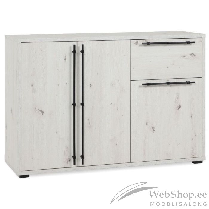 See kummut ühendab endas kaasaegse disaini ja praktilise funktsionaalsuse. Valge tamme viimistlus lisab hubasust, samas kui mustad metall käepidemed loovad stiilse kontrasti.