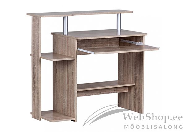 Mööbliplaadist arvutilaud. Viimistlus: sonoma tamm. Laual on neli riiulit. Üks riiul on metallist siinidel klaviatuuri jaoks.