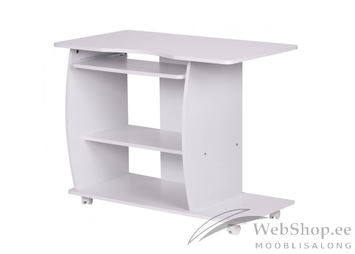 Mööbliplaadist arvutilaud. Viimistlus: valge. Laual on kaks riiulit. Üks riiul on metallist siinidel klaviatuuri jaoks. Laud on ratastel.