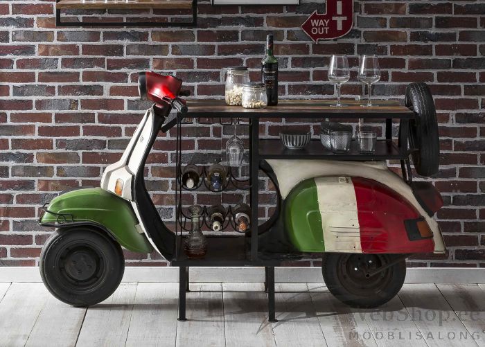 Taaskasutatud mopeedist baarilaud. Viimistlus: Itaalia. Lauaplaat on taaskasutatud puidust, mitmevärviline. Riiulid klaaside ja 6 pudeli paigutamiseks.