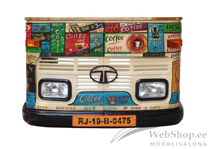 Taaskasutatud veoauto ninast baarilaud. Viimistlus: mitmevärviline. Lauaplaat on taaskasutatud puidust, mitmevärviline. Riiulid klaaside ja pudelite paigutamiseks.
