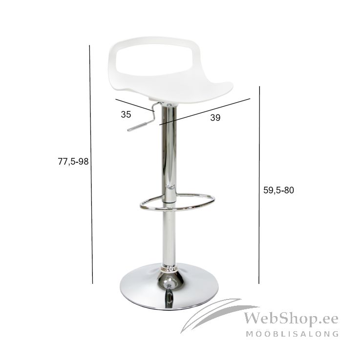 Raami värvus: kroomitud. Mehhanism ja seadistused: istme kõrgus reguleeritav gaasamordi abil. Mõõtmed: istme kõrgus 60-80cm, istme sügavus 35cm, istme laius 39cm. Lisainfo: kaalupiirang 100kg.