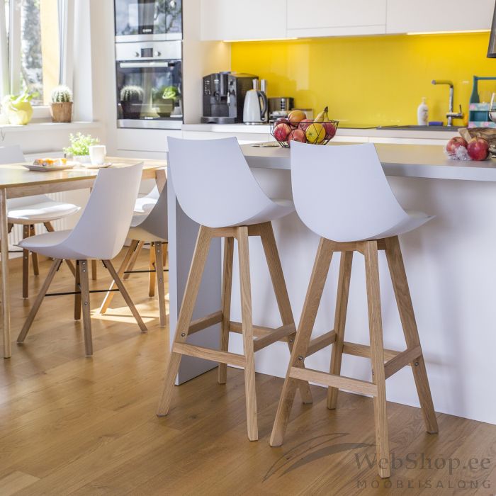 Baaripukk SONJA, valge. Mugava vormiga plastikust iste. Polsterdatud istmepõhi on kaetud kunstnahaga. Heledad tammepuidust jalad. Üldmõõdud 41x41,5xH99cm. Istme kõrgus 75cm, istme laius 41cm, istme sügavus 35cm, seljatoe kõrgus 25,5cm. Kaalupiirang: 100kg.