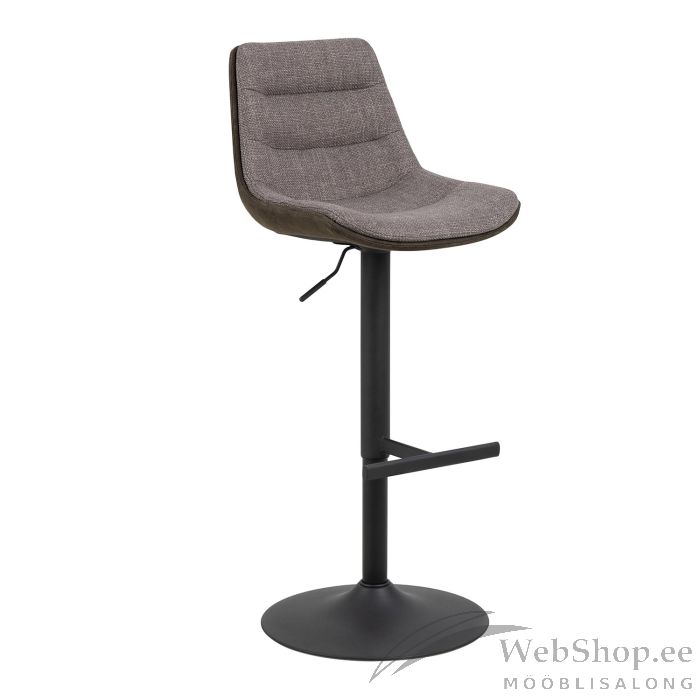Mikrokiudkangaga polsterdatud baaripukk. Kahes toonis hallikaspruun kangas. Horisontaalsete õmblusdetailide ja pöörlemisfunktsiooniga. Must pulbervärvitud metallist trompetialus koos jalatoega. FSC™ sertifikaat. Mõõdud 47x52,5xH95cm.