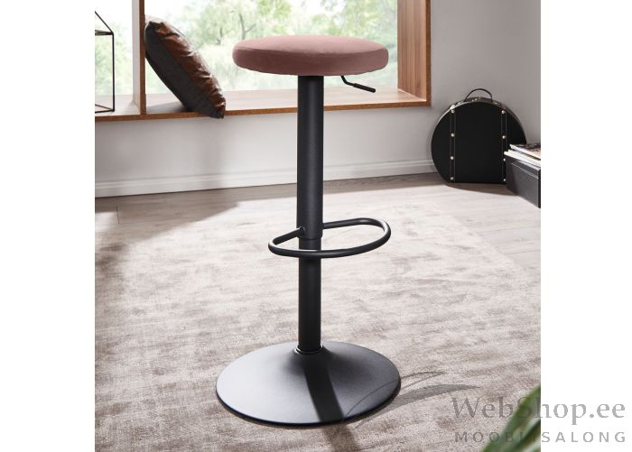 Moodsa disainiga musta värvi raamiga baaritool. Iste on kaetud roosat värvi sametiga. Tooli pehmenduseks poroloon. Tool on valmistatud lakitud metallist. Tool on pöörlev ja kõrgus reguleeritav. Maksimaalne kandevõime on 100kg.