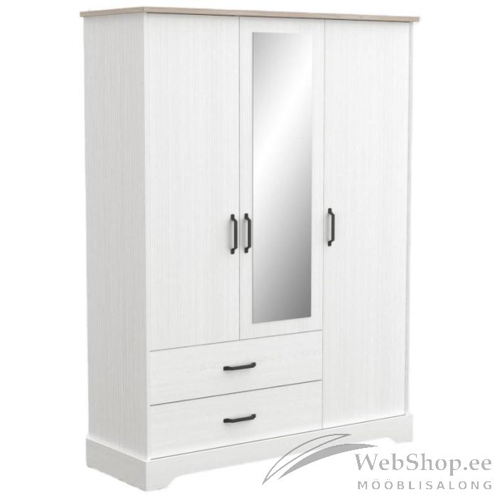 Mööbli ajas kestvuse tagab kvaliteetne mööbliplaat ABS nurkadega, mis on osaliselt valges toonis ning kronbergi imitatsioonis. Riidekapil on alumises osas kaks sahtlit, mis liiguvad metallsiinidel. Paremal pool olevad neli vaheriiulit on reguleeritava kõrgusega. Vasakul poole kahe ukse taga on riidepuutoru. Lisamugavust annab keskmise ukse küljes olev peegel.