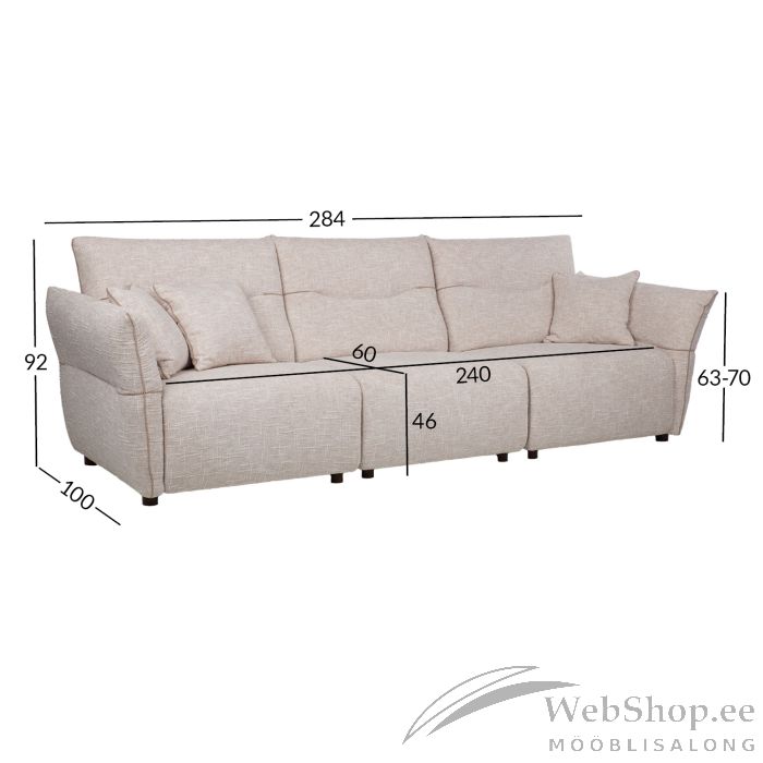 Diivani üldmõõdud: 284 x 100 x H92 cm.