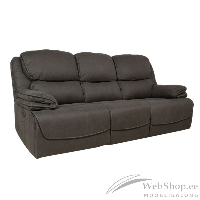 Diivan GORDY 3-kohaline manuaalne recliner 224x93xH106cm, hall. Recliner tüüpi diivani jalatoe asendit on võimalik muuta manuaalse mehhanismi abil. Jalatuge üles tõstes liigub seljatugi sujuvalt kaasa. Jalatoe tõstmiseks tõmmake tooli paremal välisküljel asuv kang üles. Surudes jalatuge alla fikseerub see automaatselt algasendisse. Keskmine iste ei ole reguleeritav. Kattematerjal: kunstnahka meenutav pehme polüesterkangas. Karkass ja vedrustus: vineer, puit, metall. Pocket vedrud. Polsterdus: polüuretaanvaht 20-28kg/m³. Diivani üldmõõdud on 224x93xH106cm. Istme laius 167cm, istme sügavus 54cm, istme kõrgus 49cm. Seljatoe kõrgus 69cm. Käetoe kõrgus maast 64cm.