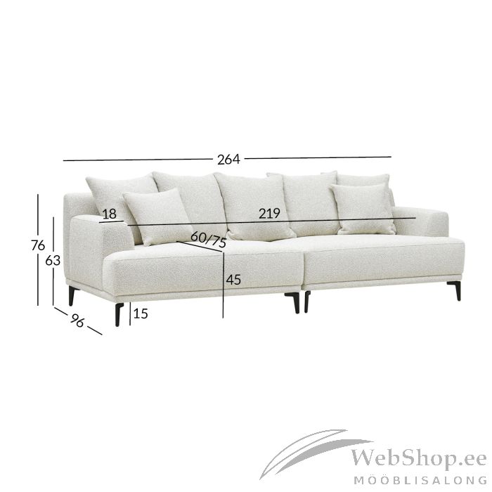 Diivan MAGNOLIA 4-kohaline, helebee˛. Luksuslik, efektse kangaga kaetud hele diivan on tõeline pilgupüüdja. Lahtised seljatoepadjad mõjuvad kutsuvalt ja pakuvad suurepärast mugavust. Diivani karkass on valmistatud männipuidust. Iste on polsterdatud kvaliteetse polüuretaanvahuga. Istmepõhjale annavad vajaliku toe ja elastsuse kvaliteetsed terasest sik-sak vedrud. Lahtised seljatoepadjad on täidetud mahulise polüesterkiuga. Seljatoepatjade mõõdud on 54x54cm / 5tk ja 42x42cm / 2tk. Diivan on üleni kaetud vastupidava, jämedakoelise struktuuriga polüesterkangaga. Diivani üldmõõdud on 264x96xH76cm. Istme laius 219cm, istme sügavus 60/75cm, istme kõrgus 45cm. Käetoe kõrgus maast 63cm, käetoe laius 18cm. Diivanil on mustad metallist jalad H15cm.