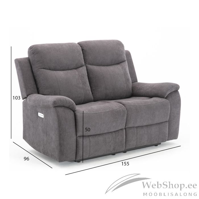 Recliner tüüpi diivani mõlema istme selja- ja jalatoe asendit on võimalik muuta elektrilise mehhanismi abil. Jalatuge üles tõstes liigub seljatugi sujuvalt kaasa lamavasse asendisse. Kattematerjal: 100% polüesterkangas 15 000 Martindale'i. Karkass ja vedrustus: puit, vineer, metall. Sik-sak ja pocket vedrustus. Polsterdus: polüuretaanvaht.