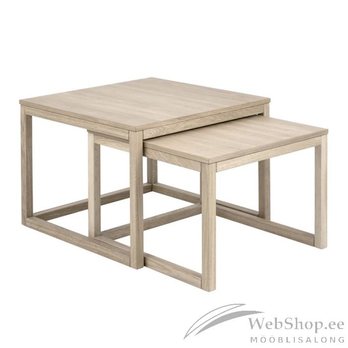 Diivanilaua komplekt CORNUS 2tk, lauaplaat: tammespooniga mööbliplaat, viimistlus: õlitatud valge pigmendiga. Komplektis 2lauda: 70x70xH50cm/61,5x61,5xH44cm.