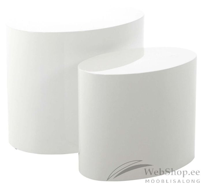 Kaheosaline diivanilauakomplekt paistab silma värske disainiga. Viimistletud pinna ja ovaalse kujuga lauakomplekt annab igale elutoale rafineeritud ilme. Komplekt sobib suurepäraselt erinevate stiilide diivanite juurde. Lauaplaat ja alus: kõrgläikega valgeks värvitud MDF. Komplektis 2 tk. Mõõdud 33x48xH40cm.