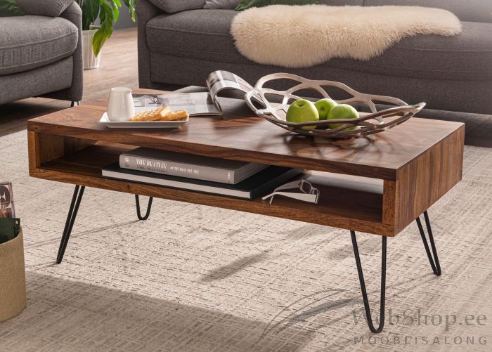 Moodsa disainiga diivanilaud. Laud on valmistatud naturaalsest (FSC sertifikaadiga) India Roosipuust, kaetud lakiga. Jalad on musta värvi metallist. Laual on üks riiul kuhu on võimalik asju paigutada. Toode on valminud käsitööna. Iga laud on originaalne ja võib erineda pildil olevast, sest on naturaalsest puidust.