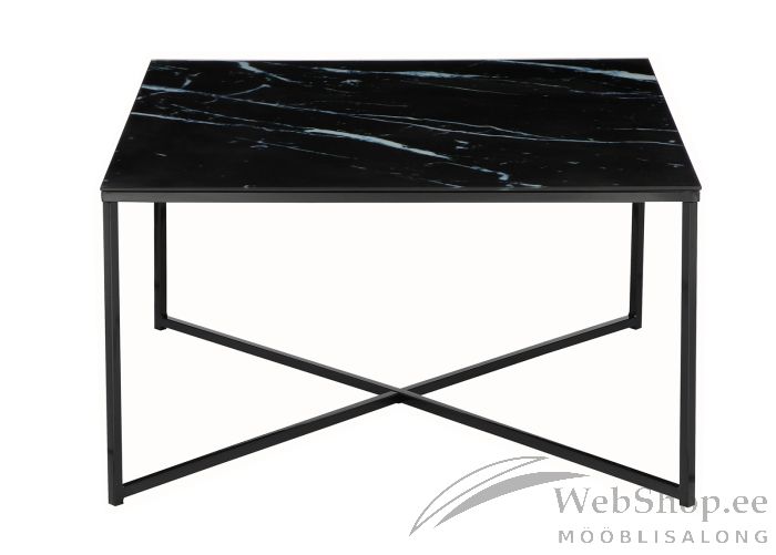 Musta värvi metallist jalgadega diivanilaud. Lauaplaat on klaasist, klaasi all on marmorivälimusega kile.